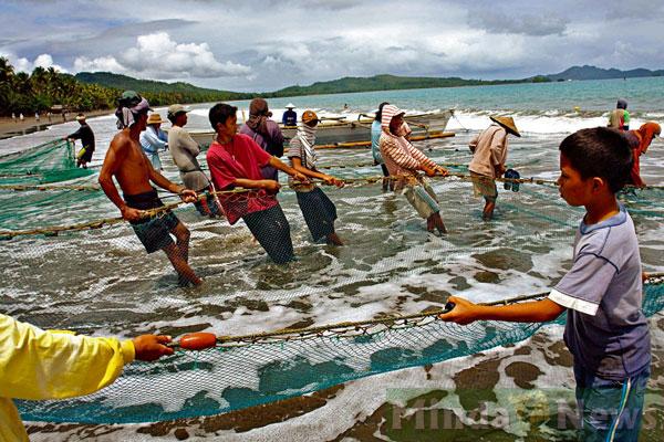 Pescadores e seus filhos recolhendo a rede de arrasto de praia em Cantilan, Surigao do Sul nas Filipinas.